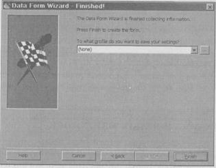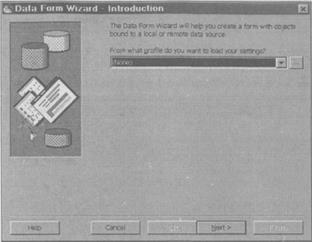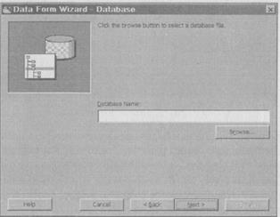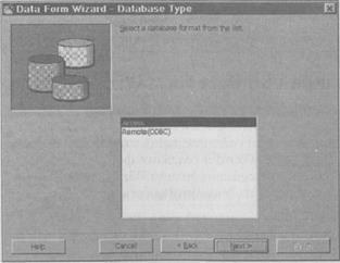 Рис. 16.15. Data Form Wizard 5. Как и в Application Wizard, вам будет предложено выбрать сценарий, сохраненный во время прошлого сеанса работы. Поскольку мы еще не сохраняли сценариев, нажмите кнопку Next и продолжайте работу. 6. В следующем окне (рис. 16.16) выбирается тип базы данных, к которой вы хотите подключиться. Вы можете выбрать между Access и удаленной базой данных (например, Microsoft SQL Server).