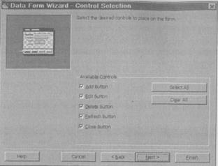Рис. 16.18. Определение параметров формы Рис. 16.19. Выбор источника записей 13. Выберите строку Titles из списка Record Source. 14. Когда выбранное поле появится в списке Available Fields, нажмите кнопку переноса всех полей в правый список (двойная стрелка вправо). Все поля базы помещаются на форму. 15. В поле Column to Sort By выделите поле Title. Когда это будет сделано, нажмите кнопку Next. 16. В окне выбора элементов (рис. 16.20) оставьте все флажки установленными. ПРИМЕЧАНИЕ Когда вы будете конструировать собственные формы для работы с базами данных, в этом окне вы сможете выбрать кнопки, которые должны присутствовать на форме. 17. Нажмите кнопку Next. 18. Последнее окно Data Form Wizard (рис. 16.21) позволяет сохранить введенные значения параметров в сценарии, чтобы ими можно было воспользоваться при следующем запуске мастера. Нам сохранять эти значения не нужно — нажмите кнопку Finish. Мастер берется за дело. Рис. 16.20. Диалоговое окно выбора элементов 19. Форма frmBrowser должна быть начальной формой нашего проекта. Щелкните правой кнопкой мыши в окне проекта и выполните команду DataBrowser Properties из контекстного меню.