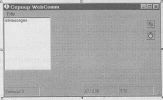 1. Создайте новый проект командой File > New Project. В диалоговом окне New Project выберите значок Standard EXE и нажмите кнопку ОК. 2. Задайте свойству Name проекта значение WebCommServer. 3. Задайте свойству Name формы Form1 значение frmMain, а свойству Caption — значение Сервер WebComm. 4. Дважды щелкните в строке Icon в окне свойств. Выберите файл W95mbx04.bmp из каталога \Common\Graphics\Icons\Computer. Нажмите кнопку Open, чтобы поместить значок на форму. 5. Запустите редактор меню командой Tools > Menu Editor. 6. Создайте меню верхнего уровня. Задайте его свойству Name значение mnuFile, а свойству Caption — значение & File. 7. Создайте в меню mnuFile команду с именем mnuFileExit. Задайте свойству Caption значение E& xit. 8. Закройте редактор меню кнопкой ОК. 9. Создайте на форме список с именем lstMessages. 10. Поместите на форму таймер, задайте его свойству Name значение tmrTimer, a свойству Interval — значение 1000. 11. Щелкните правой кнопкой мыши на панели элементов и выполните команду Components из контекстного меню. 12. Установите флажки рядом со строками Microsoft Windows Common Controls 6.0 и Microsoft Winsock Control 6.0. Закройте диалоговое окно кнопкой ОК. На панели появляются новые элементы. 13. Поместите на форму элемент Winsock. Для простоты задайте его свойству Name значение wsk, а свойству Index — значение 0. Позднее мы воспользуемся им для создания массива элементов. Не беспокойтесь об остальных свойствах, они будут заданы во время выполнения программы. 14. Поместите на форму frmMain строку состояния. Задайте ее свойству Name значение stsStatus и проследите за тем, чтобы свойство Align имело значение 2 -vbAlignBottom. 15. Дважды щелкните в строке (Custom) окна свойств, чтобы открыть диалоговое окно со страницами свойств строки состояния. 16. В открывшемся окне перейдите на вкладку Panels. 17. Введите в поле Text строку Сеансы: 0. 18. Нажмите кнопку Insert Panels, чтобы добавить в строку еще одну панель. Когда панель будет добавлена, введите в поле Index значение 2 — дальнейшие изменения будут относиться ко второй панели. 19. Выберите из списка Bevel строку 0 - sbrNobevel, а из списка AutoSize — строку 1 - sbrSpring. 20. Снова нажмите кнопку Insert Panel. Когда появится следующая панель, введите в поле Index значение 3 (работа с третьей панелью). Выберите из списка Style строку 6 - sbrDate. 21. Добавьте еще одну панель и введите в поле Index значение 4 (работа с четвертой панелью). Выберите из списка Style строку 5 - sbrTime. 22. После добавления всех панелей закройте диалоговое окно кнопкой ОК. Примерный вид формы показан на рис. 18.7.