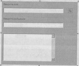 В Visual Basic разделение потоков между объектами основано на совместной потоковой модели (apartment-model threading). При таком подходе каждый поток имеет свою собственную копию глобальных данных, необходимых для работы объекта. При создании нового потока создается новая копия данных, а внесенные в нее изменения не влияют на глобальные данные других потоков. Упрощенно говоря, в результате приложения Visual Basic могут поддерживать ограниченную многозадачность. Если вам захочется больше узнать о проблемах многопоточности, обращайтесь к справочной системе Visual Basic. 13. Создайте еще одну надпись рядом с полем txtName. Задайте ее свойству Name значение lbl Тх, а свойству Caption - значение Введите сообщение:. Свойство Enabled должно быть равно False. 14. Создайте текстовое поле под lblТх. Задайте его свойству Name значение txtTx, удалите текущее содержимое свойства Text. Кроме того, задайте свойству Enabled значение False. 15. Создайте еще одно текстовое поле, расположенное на пару линий сетки ниже txtTx, и задайте его свойству Name значение txtRx. Задайте свойству Enabled значение False и удалите текущее содержимое свойства Text. 16. Задайте свойству Multiline элемента txtRx значение True, а свойству ScrollBars -значение 2 - Vertical. После создания всех элементов документ будет выглядеть так, как показано на рис. 18.8.