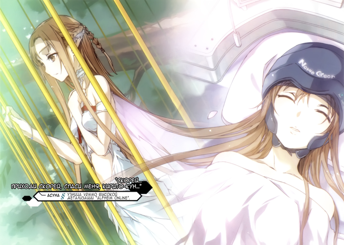 Приняв душ, я переоделся и сел на велик, который купил месяц назад. До пункта назначения было 15 километров — серьезное расстояние для велосипеда; но для моего восстановления такая нагрузка — как раз то, что надо. Дорога привела меня к недавно построенной больнице на окраине города Токородзава в префектуре Сайтама. В палате на последнем этаже больницы неподвижно лежала она. Два месяца назад на 75 уровне Айнкрада я победил финального босса, «Святого меча» Хитклиффа, пройдя, таким образом, эту смертельную игру. После этого я пробудился в больничной палате. Придя в себя, я понял, что вернулся в реальный мир. Но она, мой партнер, самый дорогой для меня человек, Асуна по прозвищу «Молния» — не вернулась. Все вопросы касательно нее остались без ответов. После того, как я, придя в себя в токийской больнице, какое-то время бесцельно бродил по коридорам, меня нашли медсестры и вернули в палату. Десятью минутами позже передо мной появился мужчина в костюме, который представился сотрудником «Отдела по противодействию чрезвычайному происшествию с SAO при Министерстве внутренних дел». Организация со столь внушительным названием, похоже, была сформирована сразу после начала инцидента с SAO, но в течение двух последующих лет они ничего не могли сделать. Впрочем, это тоже было неизбежно. Если бы они неосмотрительно вмешались в работу сервера, не отключив предварительно защитную программу, созданную Акихико Каябой, главным творцом всего произошедшего, — десять тысяч человек погибли бы от разрушения мозга. Никто не хотел такой ответственности. Они пошли другим путем — приготовились как можно тщательнее изучать состояние потерпевших, лежавших в больницах. Их единственной надеждой — крохотным светлячком, но грудой работы — оставалось изучение информации об игроках на сервере. Так они стали следить и за моим прогрессом на переднем крае игры, учитывая мой уровень и мою важную роль среди «Проходчиков» — тех, кто прилагал усилия для прохождения «Sword Art Online». Именно поэтому, когда игроки в SAO стали пробуждаться по всей стране, чиновники Министерства поспешили ко мне в палату в надежде лучше разобраться, что же только что произошло. Правительственному чиновнику в очках в черной оправе, который объявился передо мной, я поставил свои условия. Я расскажу им все, что знаю. Взамен они расскажут мне все, что я хочу знать. Разумеется, узнать я хотел, где Асуна. Поговорив несколько минут по телефону, очкарик повернулся ко мне и произнес, не скрывая замешательства: — Асуна Юки лежит в другой больнице, в Токородзаве. Но она не пробудилась… и не только она, еще триста человек по всей стране до сих пор спят. Сперва мы думали, что это просто какой-то лаг на сервере. Однако часы превращались в дни, а Асуна и остальные продолжали спать. Вопрос, по-прежнему ли это происки исчезнувшего Акихико Каябы, терзал весь мир; мои же мысли оставались противоречивыми. Я до сих пор помнил гибель Айнкрада, окутанного багровым закатом. Он тогда четко сказал. Он освободит всех выживших игроков. И к тому времени у него уже не было причин лгать. Он, несомненно, позволил себе самому исчезнуть вместе с тем миром — в этом я уверен. Однако, то ли из-за какой-то случайности, то ли по чьей-то воле сервер SAO, который должен был быть полностью отформатирован, продолжал работать. И нейрошлем Асуны по-прежнем