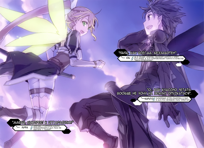Давно не виделись; а может, правильнее назвать это нашей первой встречей. Меня зовут Рэки Кавахара. Большое вам спасибо, что прочли «Sword Art Online 2: Айнкрад». Когда вышел первый том, я получил множество ценных советов на тему «как можно продолжить после такой концовки». Как ни посмотри, а игра была полностью пройдена, и мир рухнул. Даже я сам, когда это читал, чувствовал, что продолжать нечего и некуда. И вот перед вами следующий том, изрядно напрягший мой мозг, — эта самая книга. Приношу свои извинения, но время пошло вспять. Более того, это набор коротких историй. Вновь приношу свои извинения. Я раньше тоже играл в онлайновые игры. Но во всех этих играх я никогда не входил в число самых высокоуровневых игроков. Я просто тихо завидовал тем бесконечно крутым игрокам с лучшим снаряжением и репутацией, которые с легкостью побеждают монстров; всегда оставалось это чувство, что они «такие крутые! такие классные!» (ха-ха) Поэтому мне хотелось написать не только про главных героев первого тома Кирито и Асуну и про других высокоуровневых игроков-Проходчиков; гораздо сильнее мне хотелось написать про обычных среднеуровневых игроков; и четыре коротких истории в этом томе — именно о них. В каждой из них Кирито появляется и вызывает грандиозный переполох; и вот это чувство, как у Лизбет и Силики, «такой крутой! такой классный!» — именно это я сам чувствую с тех пор, как играю в ММО. По правде сказать, мне хотелось бы хоть раз испытать на себе, каково это — хвастаться перед другими каким-нибудь супероружием, которого три экземпляра на всем сервере. Есть еще кое-что, по поводу чего я должен перед всеми извиниться. Хотя все четыре игрока-девушки в этом томе совершенно разные, их партнер, как я уже сказал, всегда Кирито-сан. Мне чертовски трудно как следует объясниться по этому поводу, но я изо всех сил стараюсь найти оправдание; пожалуйста, настройте себя примерно в таком духе, как при чтении серий детективов: «преступник и жертва все время разные, а сыщик всегда один и тот же». …Не получается, да? Простите еще раз. Наконец, должен сказать Абеку-сэнсэю, рисующему постоянно возникающих новых героинь все такими же индивидуальными и симпатичными, и Мики-сану, подавшему множество идей касательно всех этих странных и сложных игровых систем: спасибо вам за вашу заботу. И всем вам, кто дочитал эту книгу до конца, — вам тоже спасибо. 26 мая 2009 года Рэки Кавахара Содержание [убрать] · 1 Пролог · 2 Глава 1 · 3 Глава 2 · 4 Глава 3 · 5 Глава 4 · 6 Послесловие автора · 7 Примечания · 8 Комментарии
