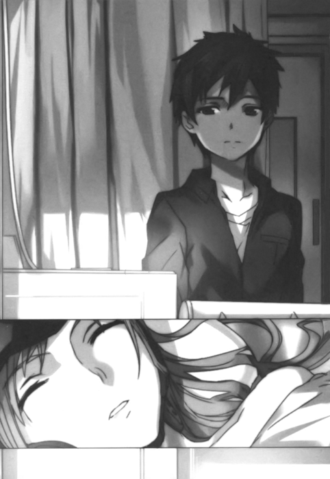 — Братиик! Ванная свободна! — крикнула Сугуха возле двери комнаты Кадзуто на втором этаже, но ответа не последовало. В тот вечер, вернувшись из больницы, Кадзуто заперся у себя в комнате и не вышел даже к ужину. Сугуха положила руку на дверную ручку, но заколебалась. Если он пойдет спать прямо так, то может подхватить простуду, убедила она себя и нажала на ручку. Качаа. Дверь открылась в затемненную комнату. Он, наверно, уже спит, подумала она и развернулась, чтобы выйти из комнаты; но тут налетел порыв холодного ветра, заставив ее задрожать. Похоже, окно было открыто. Что ж, другого пути нет, решила Сугуха, покачав головой. Тихонько, на цыпочках она прошла к окну… лишь для того, чтобы обнаружить, что ее брат сжался в комок на кровати, но совершенно не спит. — Ой, братик, прости меня. Я подумала, что ты уже спишь, — изумленно проговорила Сугуха. Через несколько секунд молчания раздался голос Кадзуто, начисто лишенный эмоций. — Извини, но не могла бы ты оставить меня одного? — Но, но в комнате такой холод… Сугуха потянулась вперед и взяла руки Кадзуто в свои. Его руки казались ледышками. — Ой, как плохо. Твои руки совсем замерзли; так ты точно простынешь. Давай быстро в душ. Немного света от уличного фонаря проникло сквозь штору и подсветило лицо Кадзуто. Лишь тут Сугуха поняла, что с ее братом что-то произошло. — Что случилось? — Ничего, — ответил он придушенным шепотом. — Но… Не дожидаясь, когда она закончит фразу, он зарылся лицом в руки. Пряча глаза от Сугухи, он произнес с самоуничижительным оттенком: — Я правда ни на что не годен. Не так давно я поклялся никогда не говорить таких пораженческих вещей… Он еще и половины фразы не произнес, а Сугуха уже поняла, что произошло. Тихим, дрожащим голосом она спросила: — Та девушка… Асуна-сан… что с ней? Кадзуто весь напрягся. Еле слышным, полным боли голосом он ответил: — Асуна… ушла далеко… очень далеко. Туда… где мои руки не могут до нее дотянуться… Теперь Сугухе все было понятно. Вид брата, который плакал перед ней, как ребенок, тронул ее сердце. Она закрыла окно, задернула шторы, включила кондиционер и села на кровать рядом с ним. Чуть поколебавшись, она снова взяла его замерзшие руки в свои. Съежившееся тело Кадзуто сразу немного расслабилось. Сугуха прошептала ему в ухо: — Выше нос. Если ты правда ее любишь, то не должен сдаваться так легко. Эти слова ей дались совсем непросто; когда она их произносила, ее сердце словно пронзил меч. Боль родилась от чувства, затаившегося в самой глубине сердца. «Я люблю братика Кадзуто», — такое чувство сейчас всплыло в сердце Сугухи. …И я тоже. Я не могу больше себе лгать. Сугуха обняла брата и осторожно опустила на кровать. Затем взяла его одеяло и нежно накрыла им Кадзуто. Сколько времени она его держала, она не знала, но сдавленные рыдания Кадзуто постепенно сменились мирным, сонным дыханием. Сугуха закрыла глаза, ее сердце тихо шептало: …Мне остается только сдаться. Все, что я могу, — погрести мое чувство глубоко, глубоко внутри себя. Потому что сердце Кадзуто уже занято ей. Слезы медленно стекали по щекам Сугухи, падали на одеяло и исчезали, впитавшись в ткань.