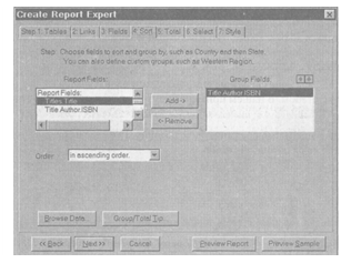 Як видно з малюнка, таблиці All Titles, Title Author і Titles зв'язуються по вмісту поля ISBN. Таблиці Title Author і Authors зв'язуються по ідентифікатору автора (поле Au_ID), а таблиці Titles і Publishers - по ідентифікатору видавця (поле PubID). Створення або видалення зв'язків між таблицями виконується на наступному етапі роботи з майстром. У нашому прикладі будуть видалені зв'язки між двома таблицями. 10. Клацніть на лінії, що сполучає таблицю Title Author c таблицею Authors, і видалите зв'язок кнопкою Delete. 11. Клацніть на лінії, що сполучає таблицю Titles c таблицею Publishers, і видалите зв'язок кнопкою Delete. 12. Натисніть кнопку Next, щоб перейти до наступного кроку роботи з майстром. Відкривається вкладка Fields, показана на мал. 9.7. 13. Клацніть на полі Au_ID під заголовком Title Author в списку Database Fields. Це поле включається в звіт (список Report Fields). 14. Двічі клацніть на полі Title під заголовком Titles, щоб включити його в список Report Fields. 15. Натисніть кнопку Next - майстер переходить до вкладки Sort (мал. 9.8).