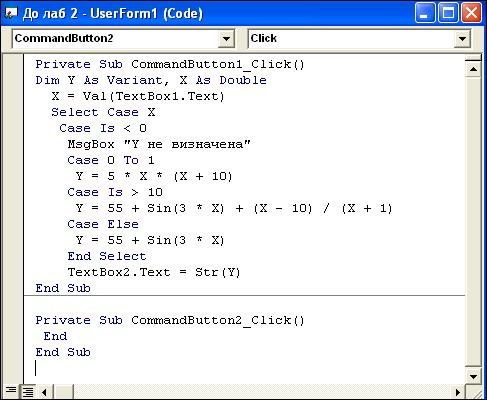 16. Для обробки події клацання на командній кнопці CommandButton1 та командній кнопці CommandButton2 розробіть коди процедур (рис. 2.17.):