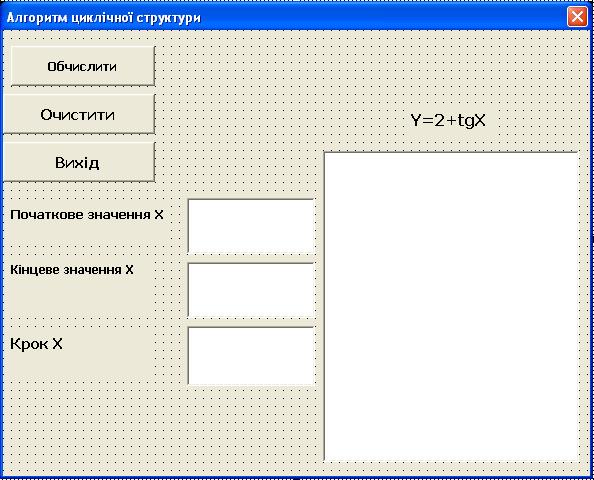 Розробка інтерфейсу користувача: При розробці інтерфейсу користувача потрібно врахувати необхідність введення даних – початкового і кінцевого значення лічильника і кроку зміни лічильника. Додаток має видавати значення функції для кожного нового значення аргументу. Розробимо форму з 4 написами і 4 текстовими полями (рис. 2.19.). Потрібно ще у формі мати три командні кнопки.