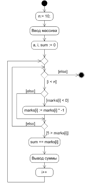 Пример выполнения лабораторной работы №4: 1. Индивидуальное задание №1: 1.1. Постановка задачи: Составить программу с использованием одномерных массивов для решения задачи. Задача: ввести массив А из 10 элементов, найти сумму элементов, меньших по модулю 5, и вывести ее на экран. 1.2. UML-диаграмма: