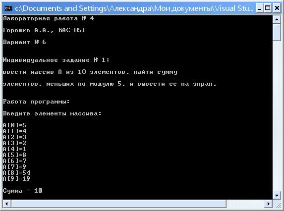 cout< < " \n\nИндивидуальное задание № 1: \n"; cout< < " \nввести массив А из 10 элементов, найти сумму\n"; cout< < " \nэлементов, меньших по модулю 5, и вывести ее на экран.\n"; cout< < " \n\nРабота программы: \n";