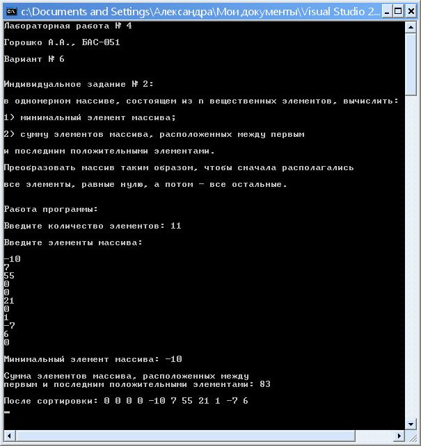 cout< < " \n\nИндивидуальное задание № 2: \n"; cout< < " \nв одномерном массиве, состоящем из n вещественных элементов, вычислить: \n"; cout< < " \n1) минимальный элемент массива; \n"; cout< < " \n2) сумму элементов массива, расположенных между первым\n"; cout< < " \nи последним положительными элементами.\n"; cout< < " \nПреобразовать массив таким образом, чтобы сначала располагались\n"; cout< < " \nвсе элементы, равные нулю, а потом – все остальные.\n"; cout< < " \n\nРабота программы: \n";
