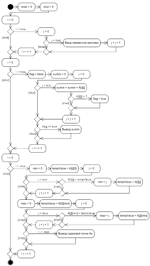 Пример выполнения лабораторной работы №6: 1. Индивидуальное задание №1: 1.1. Постановка задачи: Составить программу с использованием двумерных локальных массивов для решения задачи. Размерности локальных массивов задавать именованными константами, значения элементов массива - в списке инициализации. Задача: дана целочисленная прямоугольная матрица. Определить: 1) сумму элементов в тех строках, которые содержат хотя бы один отрицательный элемент; 2) номера строк и столбцов всех седловых точек матрицы. Примечание. Матрица А имеет седловую точку As, если As является минимальным элементом в i-й строке и максимальным в j-м столбце. 1.2. UML-диаграмма: