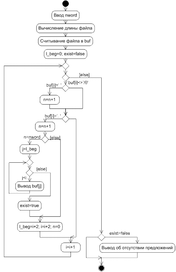 fin.seekg(0, ios:: end); int len = fin.tellg(); char *buf = new char [len + 1]; fin.seekg(0, ios:: beg); fin.read(buf, len); buf[len] = '\0'; int l_beg = 0, i = 0, n = 0, j = 0; bool exist; exist = false; while (buf[i]) { if (buf[i] == ' ') n++; if (buf[i] == '.') { n++; if (n == nword) { for(j = l_beg; j < = i; j++) cout < < buf[j]; exist = true; cout < < endl; } l_beg = i + 2; i = i + 2; n = 0; } i++; } if (! exist) cout < < " Таких предложений не найдено" < < endl; fin.close(); return 0; }