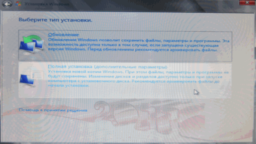 Дальше все как в обычной установке Windows 7 Доходим до выбора типа установки. Выбираем Полная установка