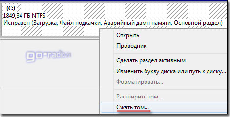 Раздел восстановления служит для хранения информации для восстановления операционной системы в случае необходимости. Стоит отметить, что объём памяти, занятый под файлы восстановления может достигать нескольких гигабайт. Этот раздел не обозначается буквой. Также кроме раздела восстановления на диске есть раздел SystemReserved, объёмом 100 мегабайт. Эти разделы являются служебными, так как они никак не используются пользователем и служат для нормального функционирования операционки. Итак, обратим своё внимание на диск C: /, который и предстоит разбить на разделы – дополнительные логические диски. Для того чтобы разделить диск C: /, щёлкаем на условном изображении диска правой кнопкой мыши. В выпавшем меню выбираем пункт “Сжать том…”.