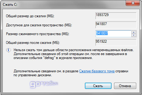 После того, как запрос закончен появиться окно, в котором будут указаны параметры сжатия. Если диск ранее не разделялся на разделы, то по умолчанию утилита предложит разбить жёсткий диск приблизительно пополам. Если первоначально диск имел объём памяти, например 1, 8 Терабайт, то после разделения образуется два раздела объёмом приблизительно по 900 Гигабайт каждый. В появившемся окне указывается размер тома C: / до сжатия (в мегабайтах) и размер сжимаемого пространства. Размер сжимаемого пространства – это объём памяти нового раздела, который будет создан. Общий размер после сжатия – это размер тома C: / после сжатия. Он будет чуть больше, чем созданный раздел диска. Как уже говорилось, система предложит разделить память жёсткого диска приблизительно пополам.