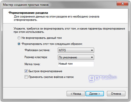 Подтверждаем выбор и в новом окне указываем файловую систему. В пункте “Форматировать этот том следующим образом: ” указываем файловую систему NTFS, размер кластера оставляем по умолчанию. Ставим галочку в чекбоксе “Быстрое форматирование” и жмем “Далее”. Появиться окно со всеми заданными параметрами. Если всё правильно, то нажимаем кнопку “Готово”.