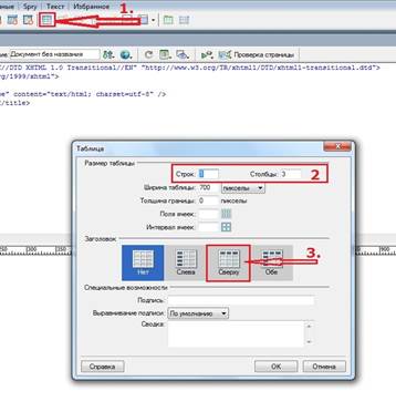 Поставьте курсор между тегами < body> < /body>, кликните на Панели инструментов(1), выбираем три строки и три столбца(2), выбираем расположение заголовка - сверху(3). Нажмите кнопку F5 для обновления.