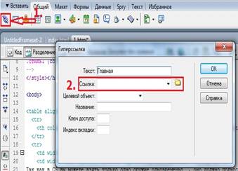 4.5 Добавим левую панель: В левой панели обычно располагается навигация по сайту, мы же просто добавим ссылку на другую страницу, перед этим скопируйте весь код страницы и создайте новый проект. Удалите заготовку страницы и вставьте код, сохраните под названием «1.html». Затем среднюю ячейку (там, где мы ранее добавили статью) очистите и вставьте вот эту статью. На этой же странице поставьте курсор в левую ячейку и впишите там слово «Главная», выделите слово и кликните на панели инструментов «Гиперссылка»(1). В диалоговом окне, в поле «Ссылка»(2) впишите index.html. Откройте файл index.html и сделайте ссылку также как и в прошлый раз, только вместо названия главная напишите «Классификация»