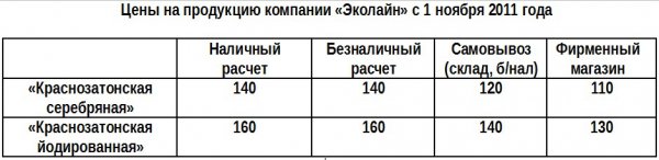 Таблица 9. Цены на продукцию, реализуемую в бутылях 19, 2 литра)