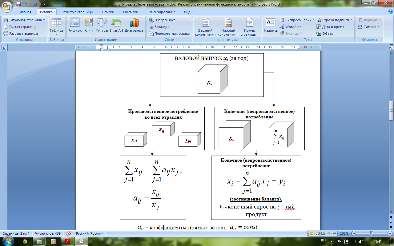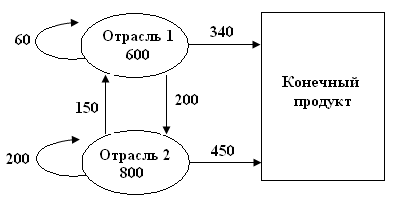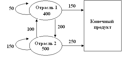 Условия применимости модели 1. Каждая отрасль является чистой, т.е. выпускает продукт только одного типа (и разные отрасли выпускают разные продукты). 2. В процессе производства отрасли нуждаются в продукции других отраслей. 3. Величина aij – объем продукции отрасли с номером i, израсходованной отраслью j в процессе производства единицы продукции. 4. Число xj, равно общему объему продукции (ВВ) j -й отрасли за некоторый промежуток времени (например, плановый год). 5. Значение yj, показывает объем продукции j -й отрасли, который был потреблен в непроизводственной сфере (объем КП) 6. Числа xij – объемы продукции i -й отрасли расходуемые j отраслью в процессе производства. 7. Балансовые уравнения имеют вид: Σ xij = xi – yi, i = 1, 2,..., n 8. Единицы измерения всех величин могут быть либо натуральными, либо стоимостными. 9. Числа aij, i= 1, 2,..., п называются коэффициентами прямых затрат отрасли j. 10. Материальные издержки пропорциональны объему выпускаемой продукции. 11. Величины aij являются постоянными коэффициентами. 12. В матричных обозначениях при заданном векторе Y (векторе конечного спроса) требуется решить систему: X – AX = Y, X ≥ 0. 13. В том случае когда решение системы существует для любого неотрицательного вектора Y, говорят, что модель Леонтьева (как и матрица А) продуктивна. 14. Продуктивность в модели Леонтьева эквивалентна прибыльности: из продуктивности следует прибыльность и наоборот. 15. Решение системы балансовых соотношений определяется формулой Y = (E - А) Х 16. Неразложимость матрицы А вмодели Леонтьева означает, что каждая отрасль использует хотя бы косвенно продукцию всех отраслей. 17. Достаточный признак продуктивности модели Леонтьева: если матрица А неотрицательна и неразложима, а сумма элементов каждой строки не больше 1 и хотя бы для одной строки строго меньше 1, то модель Леонтьева, определяемая матрицей А, продуктивна. Задача 8 По размеченному графу экономической системы определить: 1. вектор валового выпуска: 2. матрицу прямых затрат (структурную матрицу):