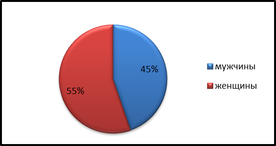 В ходе проведенного исследования было опрошено 300 респондентов среди жителей города Сыктывкара. На вопросы анкеты ответили 134 мужчины (45%) и 166 представительниц женского пола (55%). (Рисунок 16)