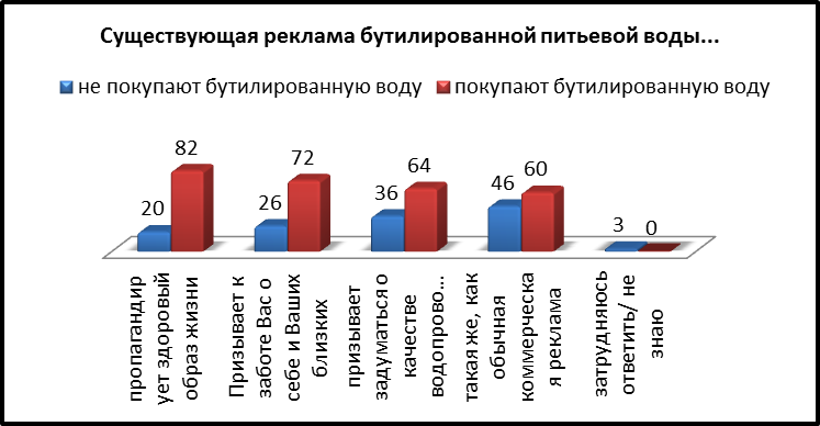 Прежде всего, необходимо выяснить отношение потребителей к существующей рекламе бутилированной воды. Полезно было бы сразу разделить мнения потребителей бутилированной воды и тех, кто не приобретает питьевую воду. (Рисунок 27) Существующая реклама бутилированной питьевой воды для третьей части респондентов ничем не отличается от любой другой коммерческой рекламы. По мнению 100 человек из 300 опрошенных такая реклама, прежде всего, содействует распространению продукции с намерением извлекать прибыль. Из них 57% (60 человек) приобретают бутилированную воду для ежедневного использования и 43% (46 человек) - нет. Остальные участники опроса, за исключением 3 человек, не покупающих бутилированную воду вообще, затруднившихся ответить на данный вопрос, относятся к такой рекламе более лояльно. Мнения этих респондентов распределились следующим образом: · такая реклама пропагандирует здоровый образ жизни – 102 человека из 300 опрошенных (82 из них покупают бутилированную воду, 20 –нет); · такая реклама призывает к заботе потребителей о себе и их близких – 98 человек (72 – употребляют бутилированную воду, 26 - нет); · Рисунок 27. Отношение респондентов к существующей рекламе бутилированной питьевой воды