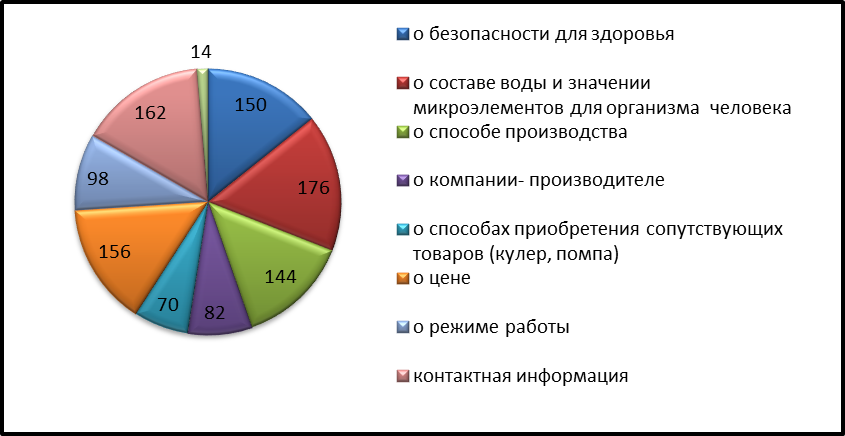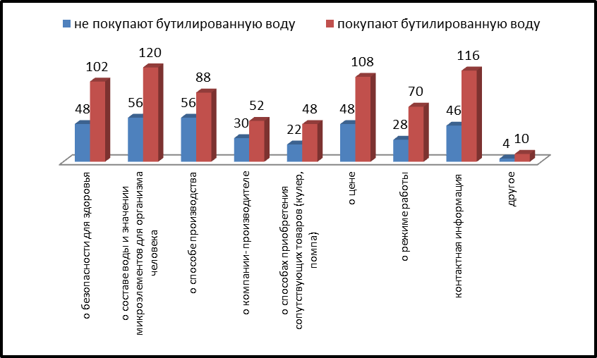 Относительно информационного наполнения рекламных сообщений о необходимости приобретения бутилированной воды мнения респондентов (Рисунки 29, 29.1) распределились следующим образом: Ø информация о составе воды и значении микроэлементов для организма человека обязательно должна присутствовать в рекламе бутилированной воды – так считают 176 опрошенных, из них 120 респондентов уже приобретают питьевую воду и 56, которые не покупают ее для ежедневного пользования; Ø 156 респондентов (из них 108 – покупают бутилированную воду, 48 - нет) считают, что в рекламе производителю необходимо указывать информацию о цене его продукции; Ø контактная информация важна для 162 опрошенных, из них 72% являются потребителями бутилированной питьевой воды; Ø информация о безопасности для здоровья важна для 102 респондентов- существующих клиентов компаний водного бизнеса и для 48 потенциальных; Ø информация о способе производства интересна практически половине всех опрошенных (144 человека), а именно 88 респондентам, употребляющим покупную воду и 56 – нет; Ø информация о режиме работы была бы полезна 98 участникам опроса, среди которых 70 приобретают бутилированную воду и 28 –нет; Ø информация о компании- производителе важна 98 опрошенным из 300; Ø информация о способах приобретения воды и сопутствующих товаров (кулер, помпа и т.д.) была бы интересна 48 респондентам, которые покупают питьевую воду и 22 респондентам, которые воду не покупают; Ø 14 респондентов предложили свои варианты необходимой информации в рекламе бутилированной воды, среди которых были: o отзывы от потребителей; o заключение специализированной службы контроля качества; o наличие и демонстрация специальных знаков, гарантии качества; o о преимуществах конкретной марки по сравнению с конкурентами.