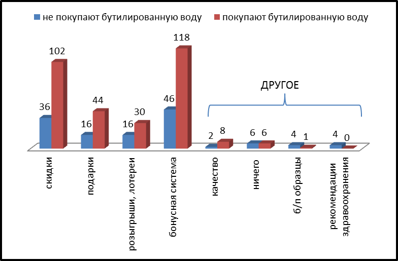 Для того чтобы привлечь потребителя компании активно используют различные бонусы и дополнительные выгоды для клиентов. (Рисунок 31) Для большинства респондентов, как для тех, кто покупает бутилированную воду (118 респондентов), так и для тех, кто не приобретает такого рода продукцию (46 респондентов) наиболее привлекательной является накопительная бонусная система, к примеру, n-й бутыль воды в подарок. Скидки и снижение цен на продукцию привлекли бы внимание 138 респондентов. Менее привлекательными для потребителей являются подарки – 60 участников опроса из 300 отметили этот вариант как привлекательный, и различного рода лотереи – всего 46 респондентов (30 клиентов компаний водного бизнеса и 16 человек, не приобретающих воду) поддержали этот вариант ответа. Этими ответами подтверждается мнение участников фокус-группы о том, что лотереи – не самый удачный стимул для покупки бутилированной воды. У потребителей отсутствует доверие к такого рода мероприятиям. Оставшаяся часть респондентов посчитали нужным высказать собственную формулировку наиболее эффективных способов стимулирования покупки: Ø 12 участников опроса заявили, что никакие дополнительные выгоды не смогут убедить их приобретать питьевую воду; Ø Для 10 участников определяющим все-таки является качество продукции; Ø 5 респондентов, из которых 4 не покупают бутилированную воду, обратили бы внимание на компанию, если она предложит бесплатные образцы своей продукции; Ø 4 респондента ответили, что готовы покупать бутилированную воду по рекомендациям органов здравоохранения (все они не являются покупателями бутилированной воды).