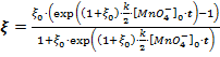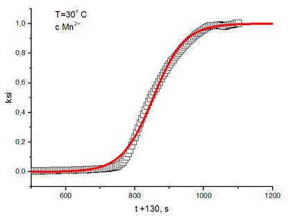 Приготовление рабочих растворов в мерных колбах на 100 мл: № 1 0.015 М щавелевая кислота № 2 0.0075 М перманганат калия № 3 0.0025 М хлорид марганца (II) Подготовка раствора для спектрофотометрии: Исследования проводились при температурах 25 °C, 30 °C, 35 °C, 40 °C, каждый раствор должен термостатироваться до нужной температуры. Затем в колбу на 250 мл налить ̴ 200 мл дистиллированной воды и по 5 мл рабочих растворов № 1 и №3. Последним добавить 5 мл рабочего раствора № 2, после приливания сразу включить секундомер. Довести раствор до метки, перемешать. Таким образом, концентрации растворов в реакционной колбе будут: щавелевой кислоты 0.0003 М Налить полученный раствор в кювету, поместить её в спектрофотометр, затем одновременно начать запись кинетики реакции и остановить секундомер, записать время. После окончания регистрации кинетики перенести данные в компьютер. Обработка данных в Origin. 1. 2. Далее для обработки понадобится вычислить значение 3. Далее были построены графики ξ – t,
