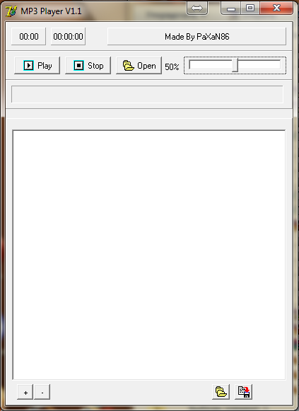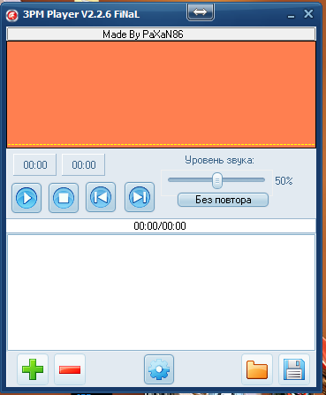 Рис. 3.5.2 Изображение основного меню. На данной вкладке расположены: · 10 активных кнопок - плей/пауза, стоп, пред. трек, след. трек, повтор трека/плейлиста/без повтора, добавление трека/папки с трека, удаление трека/всего плейлиста, кнопка шестерёнки(настройки), загрузка плейлиста, сохранение плейлиста; · 4 компонента Panel: 2 для отображения времени трека, 2 для визуальной красоты; · Компонент TrackBar - регулятор громкости. · Компонент ListBox- плейлист · 3 компонента Label-" Уровень звука: ", громкость в процентах, с двигающимся текстом в самом верху окна плеера.