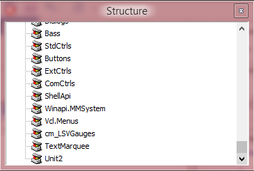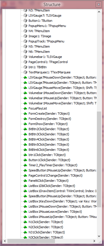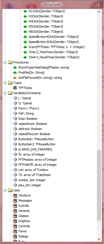 При создании всех компонентов внутреннего интерфейса каждому в отдельности присваивалось уникальное имя, содержащее информацию о назначении объекта, тип данных и расположение на рабочей области в " Embarcadero Delphi". Данная унификация позволила структурировать и размещать объекты в логическом порядке с применением списка, что в свою очередь сильно облегчало поиск необходимой рабочей единицы (рис. 3.7). Каждая рабочая единица имеет в своем составе группу, которая объединяет отдельные компоненты в зависимости от программного назначения.