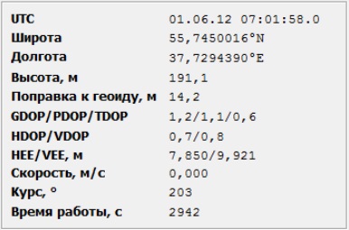 Рисунок 11. Основное окно программы 1. Краткая панель навигационной информации (Рис. 12). На панели отображаются время UTC, широта/долгота/высота, поправка к геоиду, плановая скорость, курс, факторы DOP, оценка ошибки плановых координат (HEE) и оценка ошибки по высоте (VEE)