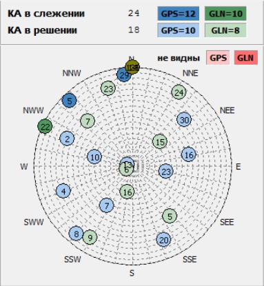 Рисунок 12. Панель основных навигационных данных 2. Панель видимости спутников на карте неба (Рис. 13). © ООО КБ «ГеоСтар навигация» 2012-07-31 14 Каждый спутник отображается кружком с системным номером КА. Цвет отображает следующее: · синим цветом обозначены спутники GPS: темно-синим – спутники, находящиеся в · слежении, голубым – спутники, используемые в решении НЗ зеленым цветом обозначены спутники ГЛОНАСС: темно-зеленым – спутники, · находящиеся в слежении, салатовым – спутники, используемые в решении НЗ розовым цветом обозначены спутники GPS, не используемые в решении НЗ · темно-розовым цветом обозначены спутники ГЛОНАСС, не используемые в · решении НЗ оливковым цветом обозначены спутники SBAS.