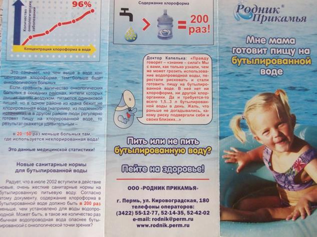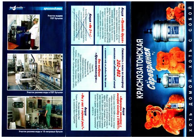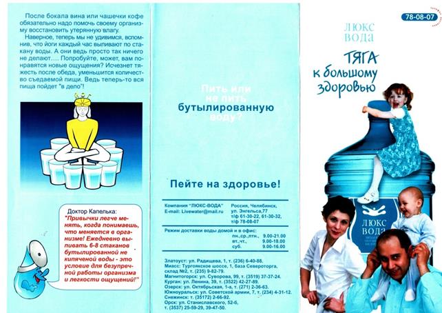 Приложение 8. (Продолжение) А.В.: Ну, все верно...А не проще было бы так? Красивая листовочка, а потом раз и ссылочка на сайт. Сайт компании нашли и все уже не спеша прочитали. Т.е. там, не надо вчитываться, вглядываться в эти мелкие буковки на бумажке. Я бы не стал читать кучу текста в буклете. Г.П.: мне понравились две листовки тоже: с семьей («Краснозатонская») и вот эта, как мальчик пьет водичку («Краснозатонская»). Она с первого взгляда бросается в глаза А.В.: Ну да, хороший мальчик, привлекает внимание... Г.П.: мальчик улыбчивый, щечки такие.... А.В.: да. Сразу видно здоровый цвет лица, волосы хорошие, улыбается – всё, здоровый ребенок Скажите, пожалуйста, откуда можно получить достоверную, на Ваш взгляд, информацию о новых товарах/ услугах/ акциях? Чему Вы больше доверяете? (советы друзей/ родственников; реклама: ТВ, радио, интернет, газеты, листовки) А.В.: в частности, нам по почте листовка пришла как вкладыш в газете. О.А.: я, например, на работе целый день радио слушаю... обратил бы внимание на такую рекламу А.В.: ну, тут опять же таки какое радио? Каждый же свое что-то слушает. В машине, я допустим, авто радио только слушаю О.А.: я тоже А.В.: молодежь, она наверно больше «Love радио» слушает... В.Н.: я только на листовки смотрю. Никогда не возникало даже желание, заходить в интернет, искать сайты компаний, занимающихся водой. Читать кучу всего..., на улицах на рекламу на баннерах тоже внимания особо не обращаю, мне это не интересно А.В.: я, кстати, не видел вашей рекламы на улицах города, только один стенд небольшой стеклянный по улице Коммунистичекой, изредка там проезжаю. На нем медведь игрушечный вроде изображен. Е.А.: еще по телевизору же была ваша реклама, но я даже и не вспомню что там именно показывали, слишком много рекламы сейчас на телевидении, все перемешивается Г.П.: я тоже вот по телевизору только видела. Давно правда уже А.В.: ну уже, т.к. компания давно на рынке, она может себя уже и не рекламировать... О.С.: а вообще, говорят же самая лучшая это «бабушкина реклама» или как это называется? Это когда твои знакомые, твои друзья пользуются этой водой. Ты смотришь как, что делается, кому что нравится или не нравится... О.А.: вам бы лучше экскурсию на завод сделать На самом деле, компания «Эколайн» ничего не скрывает от своих потребителей. Доступ к процессу производства не скрыт по семью замками, компания с радостью организовывает экскурсии. Часто бывают дети. В основном, это школьники. Можно послушать интересный рассказ о пользе артезианской воды для здоровья, увидеть своими глазами весь процесс производства от фильтрации воды из источника до розлива в готовую ПЭТ- тару. Кстати все пластиковые бутылки, начиная от объема 0, 5 литра до десятилитровых выдуваются так же на месте розлива из заготовок на специальном оборудовании. Только большие 19, 2 литра бутыли компания заказывает у поставщиков уже в готовом виде. О.С.: а как можно организовать подобные экскурсии? Я бы хотела, чтоб ребенок мой со своим классом съездили. У них в классе установлены бутыли с вашей водой, мы спокойны, что детки наши пьют хорошую воду. Для того, чтобы организовать подобную экскурсию, можно просто позвонить по телефону доставки 202-802, сказать диспетчеру о своем желании, и Вас переключат на человека, который сможет помочь в этом деле.