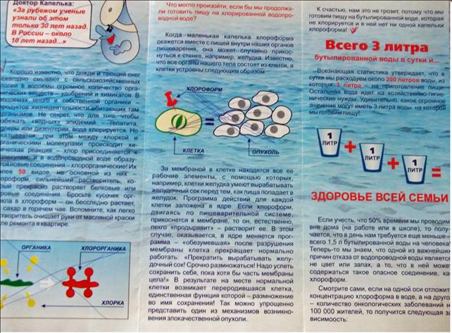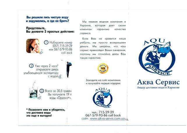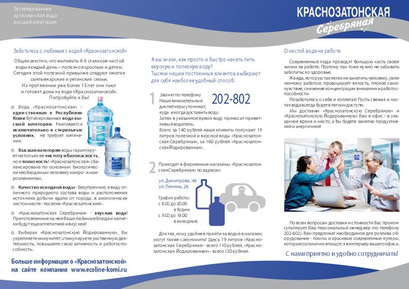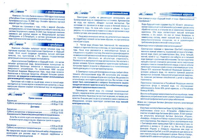 Е.А.: Мы на работе заказываем Вашу воду уже много лет. У нас довольно хорошее потребление воды, т.е. воду привозят не один раз в неделю. Сколько ни пытались собирать буковки, ни разу не получалось. Это все бесполезно, и поэтому, когда домой пришла листовка с такой акцией, я уже на нее даже не обращала внимание – буквы и буквы. Я думаю, если уж в таком большом объеме невозможно что-то выиграть, то и тут даже нечего надеяться. Приходит постоянно одна и та же буква. О.С.: по теории вероятности каковы шансы выиграть? 5%, 10%? Около двухсот участников было всего: примерно сто человек из города Ухта и столько же из Сыктывкар Е.А.: в любом случае, мне кажется, это очень приятное дополнение. Ты все равно покупаешь воду, а так еще и есть шанс что-то выиграть, пусть небольшой. В лотерейных билетах тоже выигрывают нечасто. В.Н.: как шанс... ну да, приятно! Почему бы и не попробовать пособирать? Во-первых такие акции ни к чему не принуждают: не хочешь - никто не заставляет собирать эти буковки, а во-вторых условия участия до того простые... а получать подарки все любят! Насколько данная листовка информативна? (т.е. все ли понятно? Нет ли лишней информации? Какую информацию еще следовало бы указать) О.С.: а я видела эту акцию в интернете, на листовке была ссылка на сайт. Я все подробно читала на сайте: и про акцию, и другую информацию Г.П.: а я вообще не поняла, что там за буквы такие, выкидывала все время их... а потом уже дочка мне сказала, что можно было собирать, и выиграть поездку. Но мы мало заказываем еще, 2 месяца всего. Е.А.: хорошая тоже листовка – понятно все. Оправдались ли Ваши ожидания по поводу качества воды/ процесса обслуживания? Возникло ли у Вас желание приобретать воду Краснозатонская в дальнейшем? Г.П.: да, конечно. Все нравится и качество воды, и обслуживание. Говорят, что привезут воду в течение двух часов, никогда еще не опаздывали. В.Н.: ну столько лет мы пьем Вашу воду, наверное, нас все устраивает нас О.А.: нам тоже пока все нравится, проблемы нее возникали О.С.: мы тоже довольны, бывают, конечно, проблемы, даже проблемки, например, опоздает водитель минут на 15 – ну и ладно, все же люди, пробки на дорогах Давайте смоделируем такую ситуацию. Представьте, что Вы собираетесь заказать воду в первый раз и ничего не знаете о существующих предложениях компаний. Вы попросили Вашего знакомого рассказать о возможных вариантах. Он принес Вам стопку информационных буклетов. Какой буклет заинтересовал Вас больше всего? (пояснить свой выбор) О.А.: мне понравились наверно все, кроме вот этих двух («Чистая вода» и «Родник Прикамья») Приложение 8. (Продолжение) Что не понравилось Вам в этих листовках? О.А.: тут будто обыкновенная вода... – речка («Чистая вода»), а здесь вообще непонятно даже, что вода предлагается, в смысле информация внутри ни о чем – не красиво и нелогично оформлена листовка. («Родник Прикамья») А.В.: я для себя отметил 2 брошюрки, т.к. в них основной акцент идет на здоровье. Т.е. для чего мы пьем бутилированную воду? Наверно мы заботимся о своем здоровье. И поэтому мне понравились именно эти листовки. Сделаны они довольно неплохо, вот, например, здесь: «Вместе думаем о будущем» («Краснозатонская серебряная» и «Люкс вода») и здесь тоже – сразу понятно, что акцент ставится на здоровье («Люкс вода») О.С.: а мне нравятся листовки, где используется акцент на семью. Эта компания пред