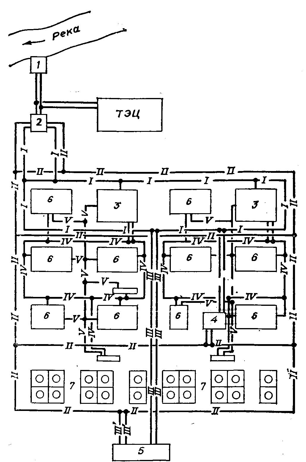 Рис. 8. Принципиальная схема водоснабжения: 1 — береговая насосная станция; 2 — насосная станция второго подъема; 3 — узлы оборотного водоснабжения; 4 — пожарная насосная станция; 5 — насосная станция очищенных стоков; 6 — технологические установки; 7 — резервуарные парки товарно-сырьевой базы; I — свежая вода низкого напора; II — противопожарно-производственный водопровод: III — очищенные стоки низкого напора; III’ — очищенные стоки высокого напора; IV — оборотная охлажденная вода; V — оборотная горячая вода.