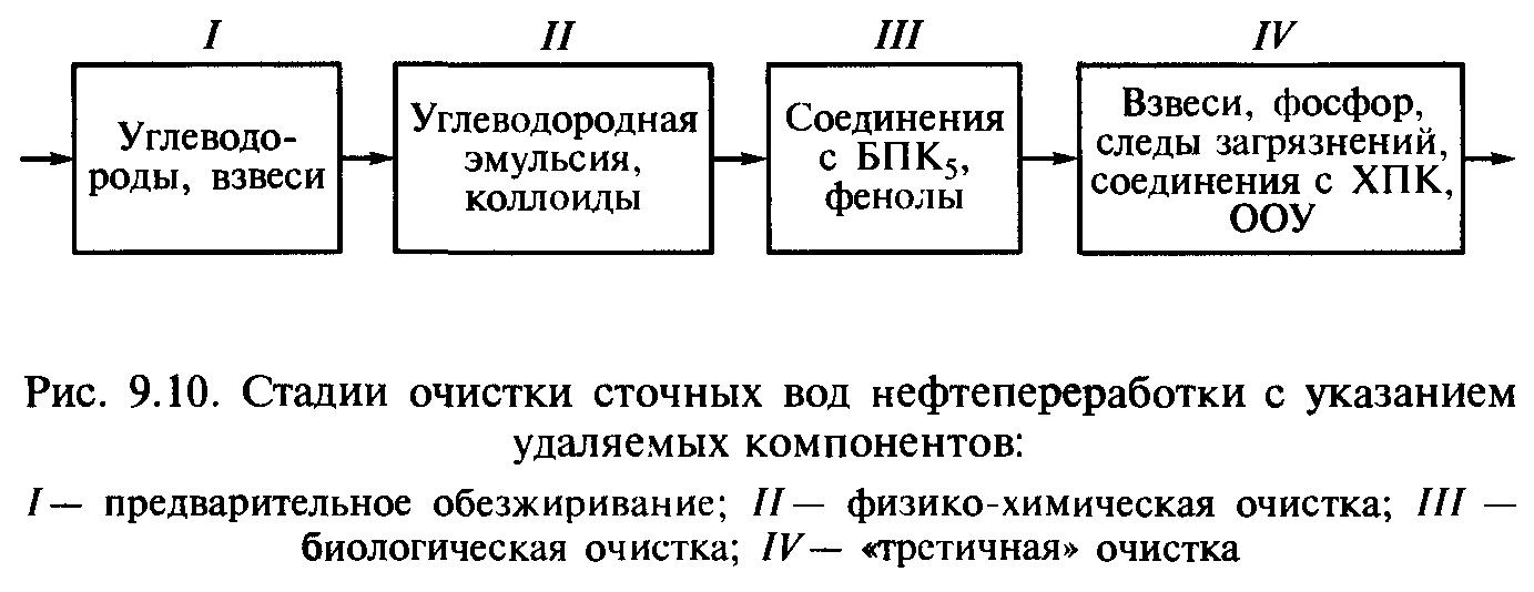 Газовые выбросы. Основным методом очистки от органических примесей является их сжигание при высоких температурах (800—1 ООО °С), недостатки метода состоят в больших затратах топлива и высокой стоимости. В последнее время получает распространение каталитическая очистка, которая проводится при более низких температурах (600 —700 °С) и основана на окислении или восстановлении органических примесей в газовой смеси в присутствии катализатора (например, платины, металлов платиновой группы или специальных композиций металлов). К катализаторам предъявляют жесткие требования: они должны окислять до 90 % органических веществ, находящихся в газовой фазе (СО и углеводородов), в широком интервале температур (250—800 °С) и в присутствии воды (до 15 %). Они не должны отравляться соединениями серы. В качестве катализаторов используют платиновые катализаторы и катализаторы на основе оксидов неплатиновых металлов (Ni, Сu, Сr, Мn). Блок очистки состоит из реактора и теплообменника. Отходящие газы нагреваются в теплообменнике и поступают в реактор на очистку. В реакторе происходит окисление или восстановление органических примесей. Автотермическое окисление или восстановление возможно при содержании органических примесей 5 — 10г/м3. При меньшем содержании окисляемых веществ увеличение температуры в реакторе будет небольшим. В этом случае в газы вводят дополнительно топливо для увеличения температуры в зоне реакции. После окончания процесса нагретые газы поступают в теплообменник, где отдают теплоту реакции поступающим газам. Обработка сточных вод НПЗ. Сточные воды НПЗ содержат разнообразные примеси. Организация процесса обработки сточных вод предусматривает предварительное разделение стоков в зависимости от содержащихся в них примесей и их индивидуальную обработку, адаптированную для каждого уровня загрязнения. В качестве этапов обработки можно выделить следующие методы: - предварительное обезжиривание— позволяет удалить взвеси (песок, глину, мелкий гравий), поверхностные пленки и капли размером 100 — 200 мкм; - физико-химическая очистка— удаляет коллоидные загрязнения — мелкие взвеси (тину, продукты коррозии), углеводороды в виде механической или химической эмульсии; - биологическая очистка— позволяет удалять растворенные и способные к биоразложению загрязнения — кислородсодержащие соединения (кислоты, альдегиды, фенолы, растворители): соединения серы типа S2O32-; частично ароматические углеводороды; ионы NH4+; - «третичная» очисткав последнее время применяется все чаще и имеет своей целью либо удовлетворить более строгие нормы, либо сделать возможной рециркуляцию воды. «Третичная» очистка применяется в следующих случаях: o для улучшения процесса осветления и удаления фосфатов; o для более полного удаления фенолов (биологические фильтры); o для снижения содержания ароматических соединений и уменьшения ХПК (гранулированный активированный уголь).