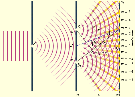 В этом случае I max = 4 I 0, I min = 0. Формулы (*) и (**) являются универсальными. Они применимы к любой интерференционной схеме, в которой происходит сложение двух монохроматических волн одной и той же частоты. Если в схеме Юнга через y обозначить смещение точки наблюдения от плоскости симметрии, то для случая, когда d < < L и y < < L (в оптических экспериментах эти условия обычно выполняются), можно приближенно получить: