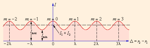 где Δ = r 2 – r 1 – так называемая разность хода. Из этого выражения следует, что интерференционный максимум (светлая полоса) достигается в тех точках пространства, в которых Δ = m λ (m = 0, ±1, ±2,...). При этом I max = (a 1 + a 2)2 > I 1 + I 2. Интерференционный минимум (темная полоса) достигается при Δ = m λ + λ / 2. Минимальное значение интенсивности I min = (a 1 – a 2)2 < I 1 + I 2. На рис. 3.7.4 показано распределение интенсивности света в интерференционной картине в зависимости от разности хода Δ.