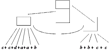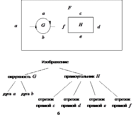 Рис. 9. Изображение (а) и его иерархическое Иерархия предполагает описание сложных объектов с помощью более простых подобъектов. Те, в свою очередь, могут быть описаны с помощью подобъектов следующего уровня и т.д. Этот подход основан на аналогии между структурой объектов и синтаксисом языков. Он приемлем тогда, когда простейшие подобъекты вычленять и распознавать легче, чем изображение (объект) в целом. Правила композиции простейших (непроизводных) элементов при описании объекта в целом называют грамматикой языка описания объектов. Распознавание объекта состоит в распознавании непроизводных его элементов и синтаксическом анализе (грамматическом разборе) " предложения", описывающего данный объект. Преимущество лингвистического подхода проявляется в том случае, если удаётся большое количество сложных объектов представлять с помощью небольшого множества непроизводных элементов и грамматических правил (например, распознавание устных слов по последовательности фонем). На рис. 10 представлен пример описания объекта (а) при помощи операции композиции " составления цепочки" из непроизводных элементов (б):