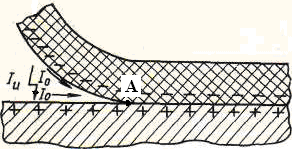 Рис. 8. Схема электризации твёрдых материалов при разделении Iо – ток, обусловленный омической проводимостью разделяемых поверхностей; Iи – ток ионизации в зазоре между разделяемыми поверхностями; А – точка начала разделения поверхностей
