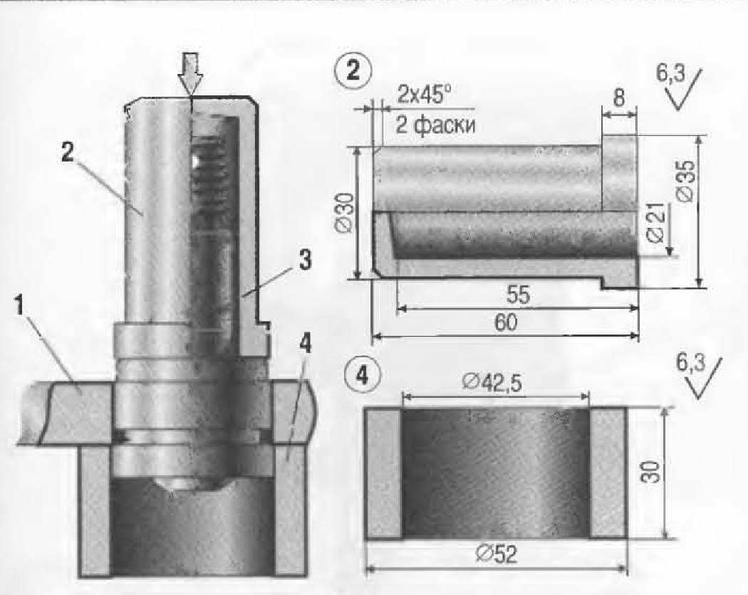 Рис. 3.5. Запрессовка шарниров рулевых тяг: 1 – опора, 2 – тяга, 3 – оправка, 4 - шарнир