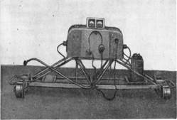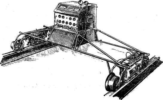Магнитный рельсовый дефектоскоп СФТИ Магнитный рельсовый дефектоскоп СФТИ Сибирского физико-технического института применяется для сплошной проверки рельсов. На метрополитене работают две модели этих дефектоскопов: однониточный СФТИ-9 и двухниточный СФТИ-11.Однониточный дефектоскоп СФТИ-9 имеет ограниченное применение. Он используется для проверки рельсов покилометрового запаса, выборочной проверки рельсов в пути, а также на рельсосварочной станции, где им проверяют рельсы до сварки и рельсовые плети после сварки, причем проверка ведется как со стороны головки, так и со стороны подошвы рельса. Двухниточный дефектоскоп СФТИ-11 используется для сплошной проверки рельсов, лежащих в пути. Принцип работы дефектоскопов СФТИ основан на использовании вихревых индукционных токов Фуко, возникающих под действием переменного магнитного поля стержневых электромагнитов. Обмотки электромагнитов питаются переменным током высокой частоты (500 гц) от лампового генератора. При движении тележки по рельсам искатели улавливают изменение суммарного магнитного поля в месте расположения дефекта. Возникающий при этом в индукционных искательных катушках слабый ток усиливается ламповым усилителем низкой частоты, после чего поступает в телефонные наушники и к индикаторному прибору (миллиамперметру). Таким образом, дефекты в рельсах отмечаются двумя сигналами: сильным звуком в телефонных наушниках и резким отклонением стрелки миллиамперметра.