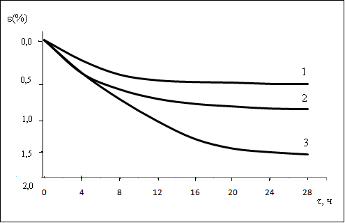 Рис.1.1 Деформация при 1200 На рис. 1.2 приведены кривые деформации при нагреве и ползучести, полученные в режиме ступенчатого изменения нагрузки для композиций: Э/к- Режим последовательного ступенчатого нагружения под нагрузкой: 0, 2; 0, 4 и 0, 8 МПа деформация за 28ч составляет 14%. Нагрузка 0, 4 МПа дополнительно деформирует образец на 0, 5% за время от 28 до 48ч. Увеличение нагрузки до 0, 8МПа деформирует образец еще на 0, 7%. Т.о., общая деформация за 68ч составляла