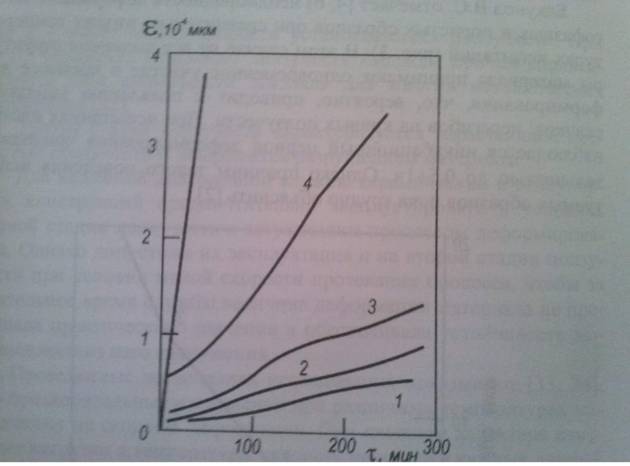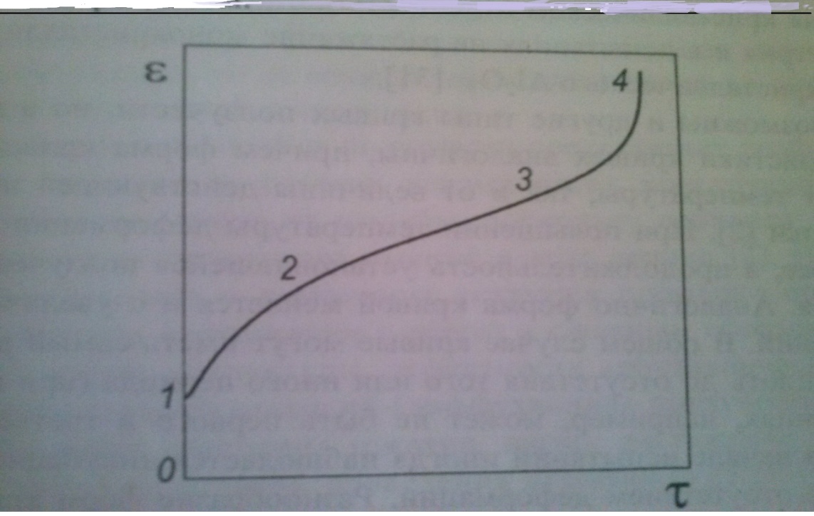 Типичная классическая кривая ползучести, представляющая зависимость деформации (ε) от времени (τ), при постоянной температуре и нагрузке приведена на рис. 1.5. Она характерна для большинства материалов и имеет следующие периоды[18]. Вначале на участке 0-1 наблюдается упругая(мгновенная) деформация, затем до точки 2 происходит неупругая деформация – наблюдается «неустановившаяся ползучесть» или первая ее стадия (уч. 1-2); на участке 2-3 скорость деформации постоянна, что соответствует периоду «установившееся ползучести» или второй стадии ползучести и, наконец, выше точки 3 наблюдается деформация с увеличивающейся скоростью (ускоряющаяся ползучесть), то есть наблюдается третья стадия ползучести – разрушение. Разделение на стадии (участки) условно, т.к. ползучесть является непрерывным процессом.