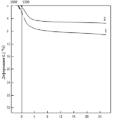 Рис. 2.11. Деформация композиции a-Al2O3-H3PO4 (Т: Ж=2: 1) при нагреве и ползучести (13000С) под стандартной нагрузкой МПа: 1 – 0, 2 и 2 – без нагрузки Среднюю скорость деформации (ползучести)