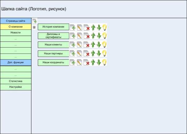 Требования к управлению разделами сайта Для управления разделами сайта должны быть предусмотрены следующие функции: - создание подраздела 1 уровня; - создание подраздела 2 (и далее) уровня; - редактирование контента страницы; - удаление раздела; - перемещение раздела вверх в списке; - перемещение раздела вниз в списке; - признак показа (show) или не показа (hide) страницы в клиентской части сайта; - отображение списка подразделов выбранного уровня.