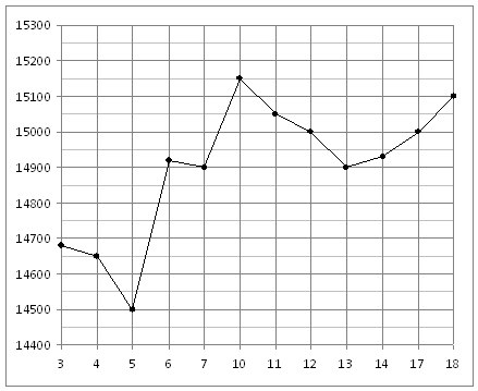 ЕГЭ (Досрочный экзамен). Математика. Часть Б. Б3 На рисунке жирными точками показана цена олова на момент закрытия биржевых торгов во все рабочие дни с 3 по 18 сентября 2007 года. По горизонтали указываются числа месяца, по вертикали — цена тонны олова в долларах США. Для наглядности жирные точки на рисунке соединены линией. Определите по рисунку, какого числа цена олова на момент закрытия торгов впервые за данный период стала равна 14900 долларов США за тонну.