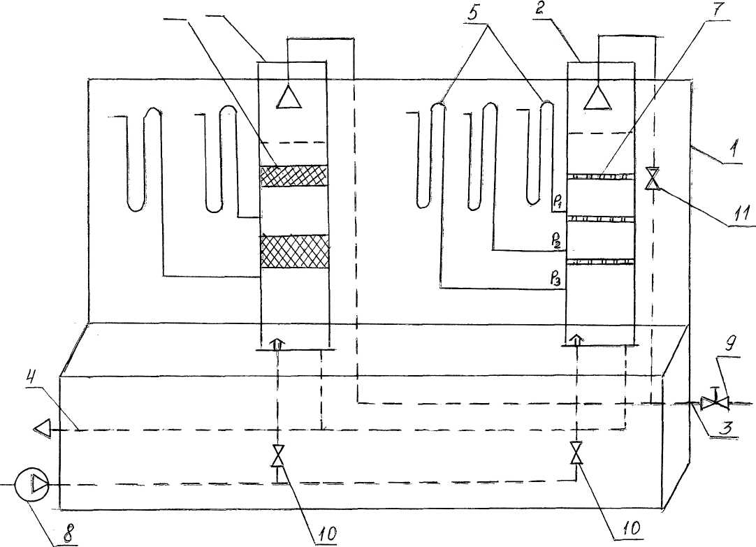 6. Насадки 7. Ситчатая тарелка 8. Вентилятор 9. 10 Задвижка 3. Методика проведения работы Приступая к работе закрыть задвижки 10, задвижку 9 на выход воздуха в атмосферу - открыть. Затем включают вентилятор 8. Открывая задвижки 10 в одну из колонн и прикрывая задвижку 9 устанавливают показания дифманометра и записывают показания в мм.вод.ст. под тарелкой или решеткой р, и над тарелкой или насадкой р2, находят гидравлическое сопротивление каждого слоя _pl = Pl - Р2, АР2 = Р2 - РЗ И Т.Д. Затем открывают воду и определяют гидравлическое сопротивление насадки или тарелки при различных расходах воды и воздуха, а также в режиме захлебывания, т.е. когда задвижка 10 будет полностью открыта, расход воздуха увеличивают закрытием задвижки 9. Показания дифманометров записывают в таблицу, затем определяют гидравлическое сопротивление слоя рсл или тарелки Рт- 4. Обработка результатов Таблица опытных данных