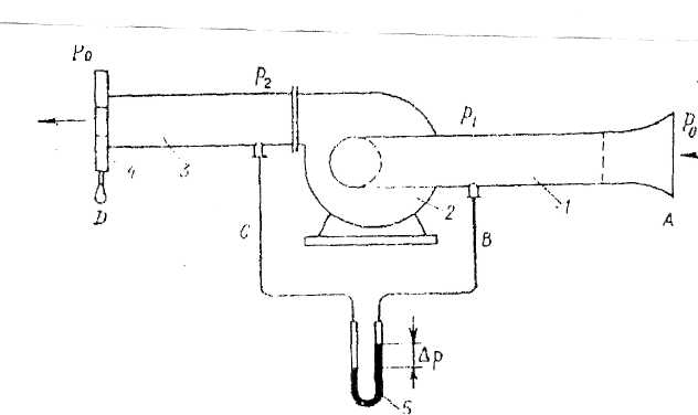 т.е. вентилятор всегда создает такую разность давлений, которая равняется гидравлическому сопротивлению сети, другими словами, он сообщает воздуху такое количество энергии, которое необходимо для преодоления этого сопротивления. Совмещая характеристики вентилятора и сети, т.е. графики рис.2 и 4, получают график работы центробежного вентилятора на сеть (рис.5). Точку пересечения линий Q - Ар и Q - Арс на этом графике, в котором Ар = Арс, называют рабочей точкой. Положение рабочей точки определяет все величины, характеризующие работу вентилятора при той же частоте вращения могут сильно отличаться - см. рабочие точки А и В. Вторую часть работы составляет посторонние характеристики сети и графика работы вентилятора на сеть. Сетью называют тот трубопровод или канал, на который работает вентилятор. В данной установке сеть состоит из всасывающего и нагнетательного трубопроводов.