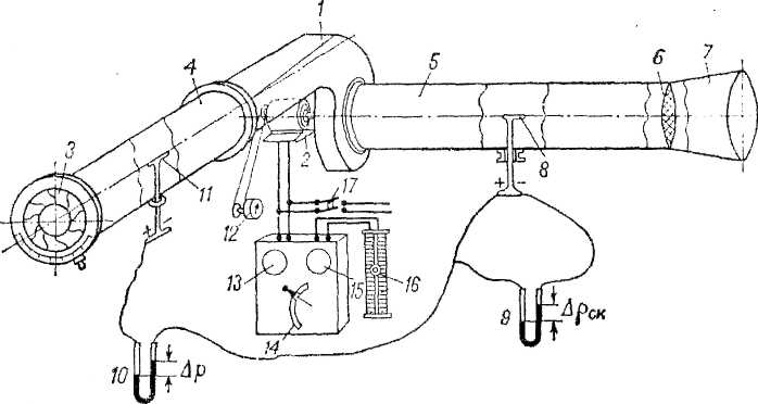 Рисунок 6. Схема установки: 1 - центробежный вентилятор; 2 - электродвигатель постоянного тока; 3 - диафрагменный затвор; 4 - труба нагнетательная; 5 - труба всасывающая; б - сетка; 7 -раструб; 8, 11 - трубки Пито и дифманометры; 12 — тахометр; 13 - амперметр; 14, 16-реостаты; 15 - вольтметр; 17 - рубильник. Методика проведения работы Для получения характеристик вентилятора Q-Ap, Q-N и Q - г| проводят первую серию опытов (10 наблюдений) при постоянной частоте вращения п, которую задает преподаватель (не более 1200 об/мин). Расход перемещаемого вентилятором воздуха изменяют диафрагменным затвором 3, меняя его открытие. Для получения характеристики сети Q - Арс проводят вторую серию опытов (5 наблюдений), при которой открытие затвора 3, т.е. геометрическая характеристика сети, остается постоянным (его задает преподаватель), а расход воздуха меняют путем изменения частоты вращения вентилятора. Необходимые для построения характеристик вентилятора и сети значения Q, Ар, N, Т| определяют путем соответствующей обработки показаний контрольно -измерительных приборов, полученных во время испытания. Показания дифмано-метра 9, дифманометра 10, амперметра 13 и вольтметра 75 снимают одновременно по команде «отсчет». Эту команду подает студент, регулирующий частоту вращени вентилятора, после того как диафрагменный затвор 3 переставлен в новое положение и восстановлена реостатами заданная частота вращения (1 серия опытов) или после того как установлена новая частота вращения (2 серия опытов). После ознакомления с описанием работы и с установкой в натуре проверяют правильность положения трубок Пито в трубопроводах, нулевые положения жидкости в дифференциальных манометрах и с разрешения преподавателя пускают вента лятор - включают рубильник и плавно выводят сначала пусковой реостат 14, а. зате? регулировочный 16. Остановку вентилятора после окончания работы производят в обратном порядке. Обработка опытных данных и составление отчета Полученные данные обрабатывают в следующей последовательности. 1. Ар = р2 - pi - разность давления, создаваемую вентилятором, определяют Как видно из рис. 6, дифманометр 10 присоединен к трубкам Пито так, что он показывает разность между общим (статическое + динамическое) давлением в нагнетательном трубопроводе и общим давлением во всасывающем трубопроводе. Эт(показание дифманометра равно разности статистических давлений воздуха после и до вентилятора, так как динамические давления во всасывающем и нагнетательном трубопроводах одинаковы, потому что одинаковы диаметры обоих трубопроводов. 2. N - мощность, потребляемую вентиляционной установкой, рассчитывают N = UI (6) Здесь U— напряжение постоянного тока, В; /-силатока, А. 3. Q - расход перемещаемого вентилятором воздуха рассчитывают по урав Q = wf. (7) Здесь w - средняя скорость воздуха в трубопроводе, м/с, f = 0, 785d - площадь поперечного сечения трубопровода, м2, d - внутренний диаметр трубопровода, м) Среднюю скорость воздуха w находят следующим образом. Дифференциальный манометр 9 (см. рис. 6), присоединенный к трубке Пито 8, которая установлена по оси всасывающего трубопровода, показывает (мм вод. ст.) скоростное (динамическое) давление Арск - кинетическую энергию единицы объема воздуха в центре этого трубопровода: